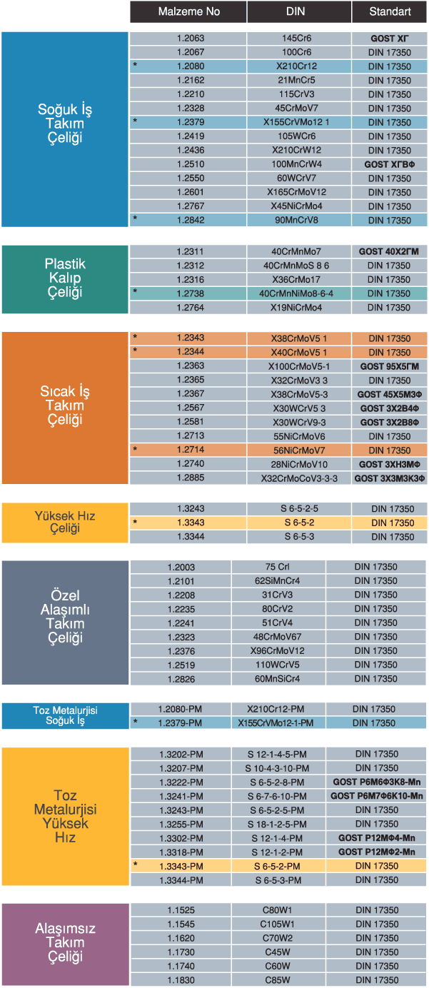Takım Çeliği çeşitlri olarak Soğuk iş takım çelikleri -Sıcak iş takım çelikleri -Plastik iş takım çelikleri -Yüksek hız takım çelikleri.